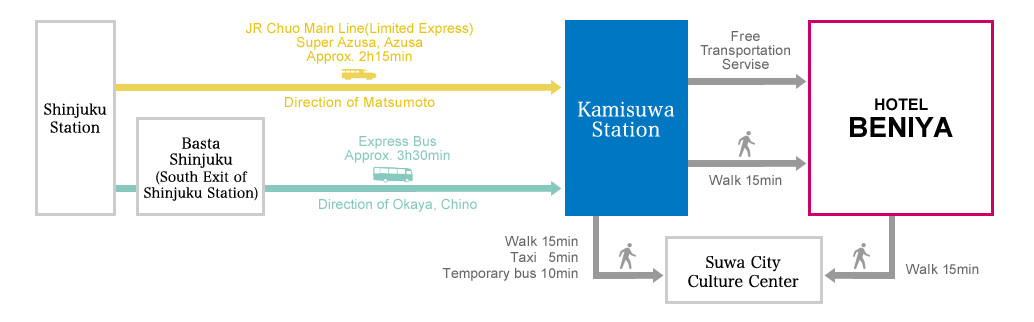 From Shinjuku Station to Kami-suwa, by JR Chuo Main Line.